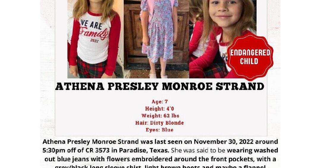 SAN ANTONIO KTSA News It has now been two days since a 7-year-old girl in Wise County northwest of Ft. Athena Strand s stepmother. Athena went missing from Paradise Texas Wednesday November 30th around.